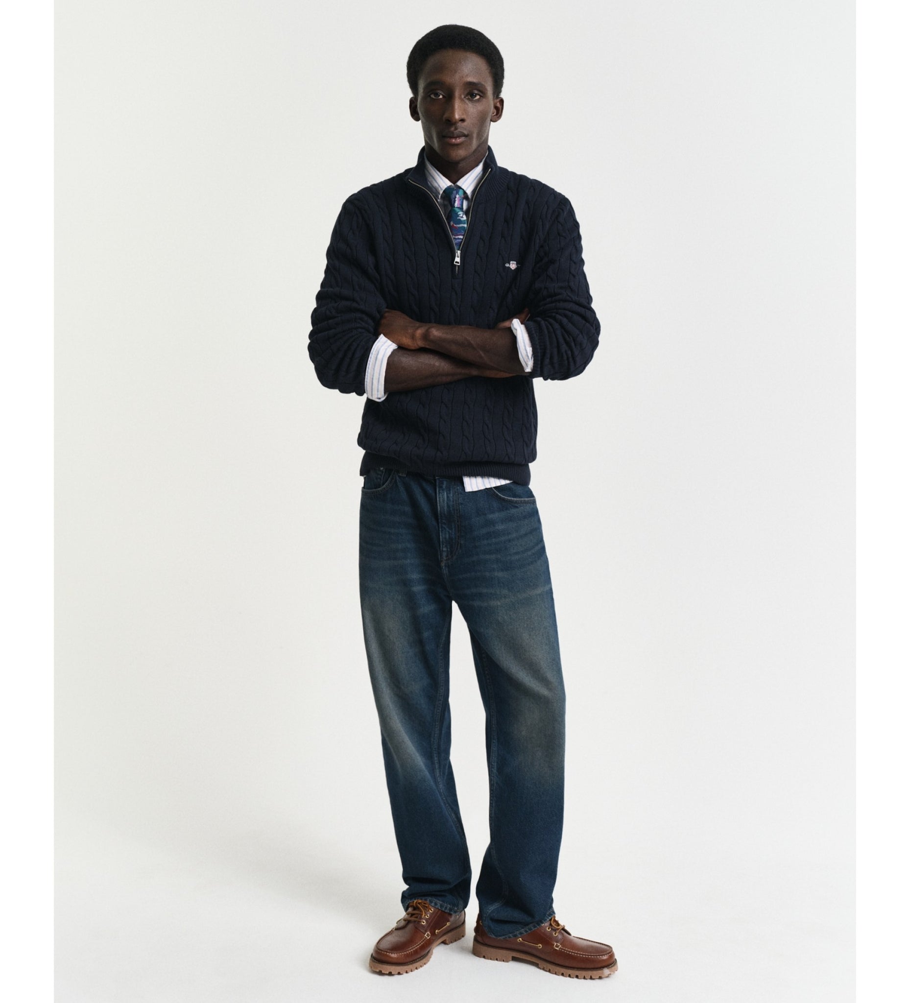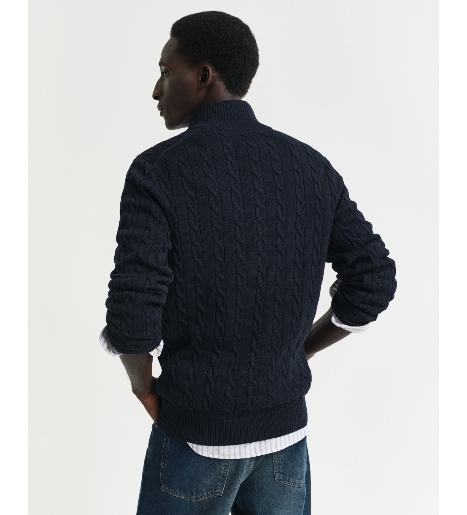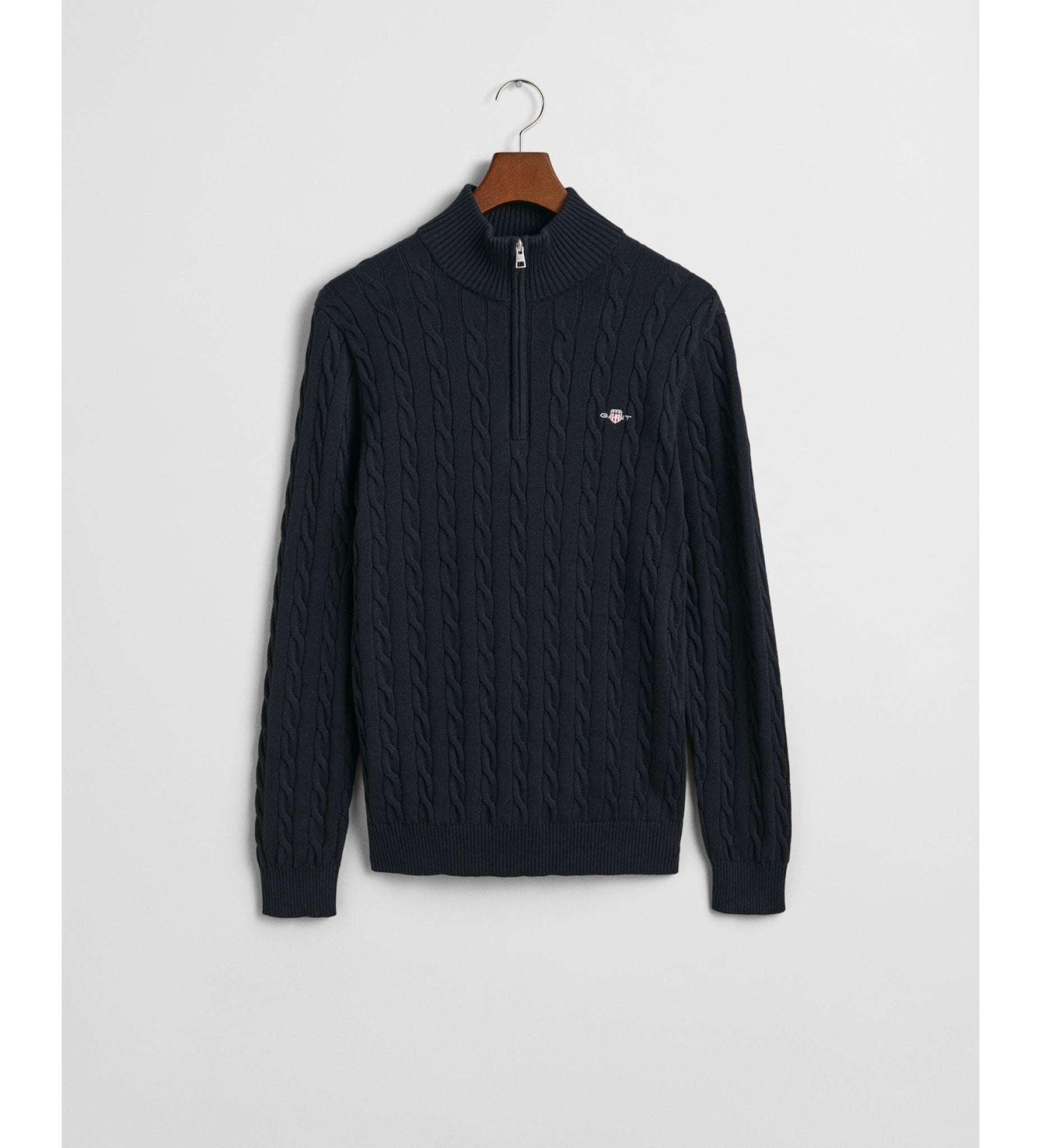 Designed in cotton with an all-over cable knit structure, this soft sweater has a regular fit and a half-zip collar. A preppy essential, it is detailed with our iconic GANT Archive shield graphic embroidered at the chest and features ribbed endings at the neck, hem and cuffs.