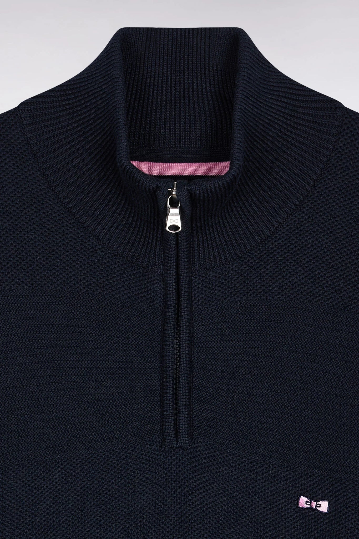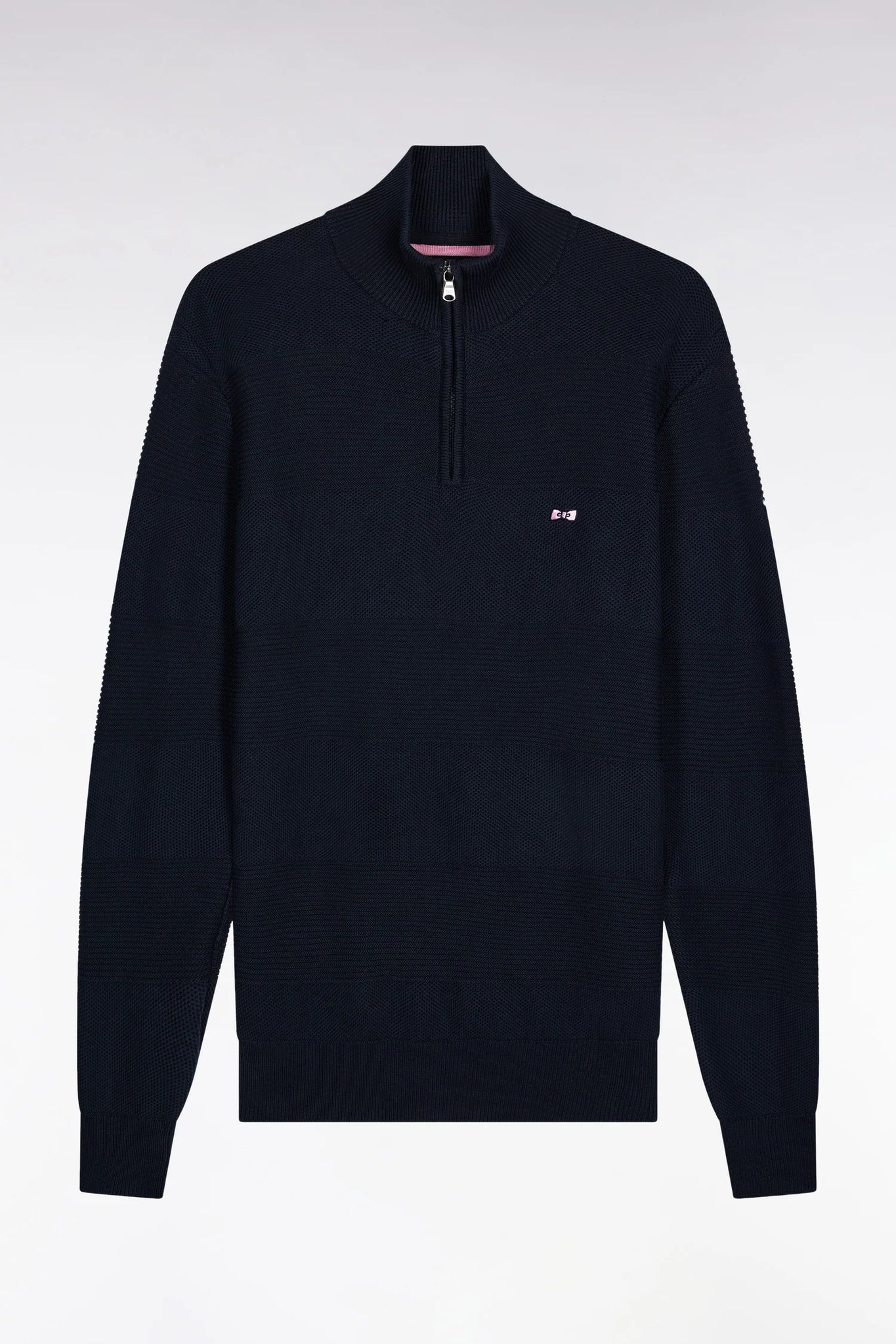 Proud of its sporting heritage, this trucker-zip sweater in pure cotton features a double knit while guaranteeing a long-lasting feeling of comfort. Its play of textures recreates, tone-on-tone, the emblematic stripes of rugby jerseys. The comfortable straight cut, high zip collar and pink bowtie embroidery on the chest make this graphic yet timeless piece perfect for combining style and casualness in everyday life. This model, which has become a classic in the Eden Park men's wardrobe, is available in 4 timeless shades