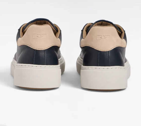 Low-top, two-tone sneakers in navy leather and sand suede leather.