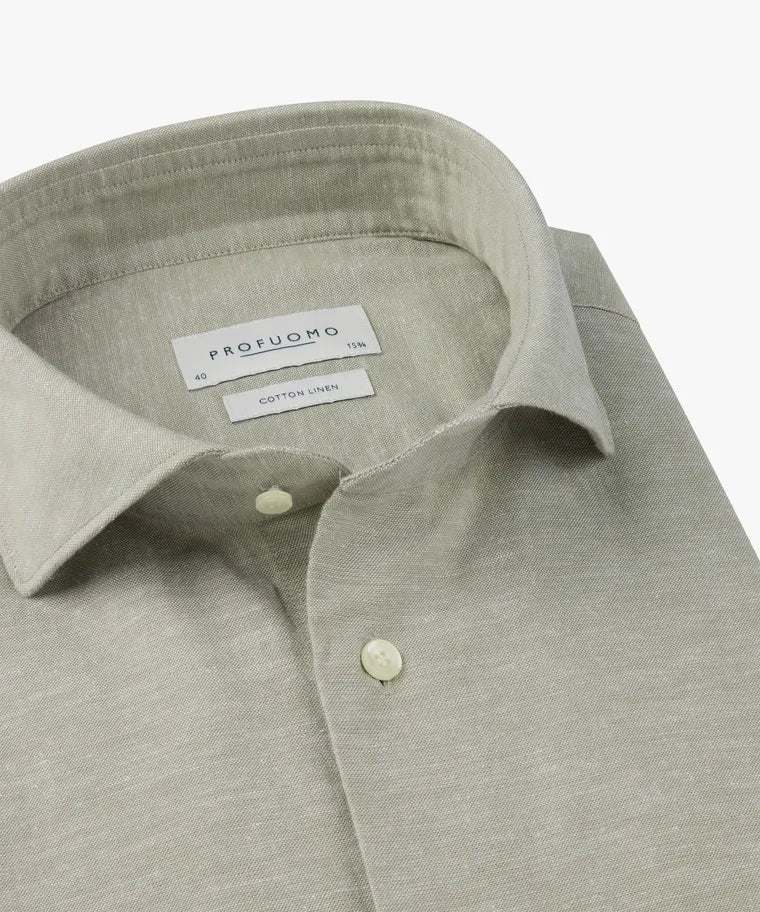 This Profuomo Cotton-Linen blend shirt is the perfect piece for your casual Summer looks. The solid, light mid-green colour gives this shirt a timeless fashion feeling. Available in a slim fit with a cutaway collar. You will be looking your best this Summer by pairing this shirt with chinos and shorts.