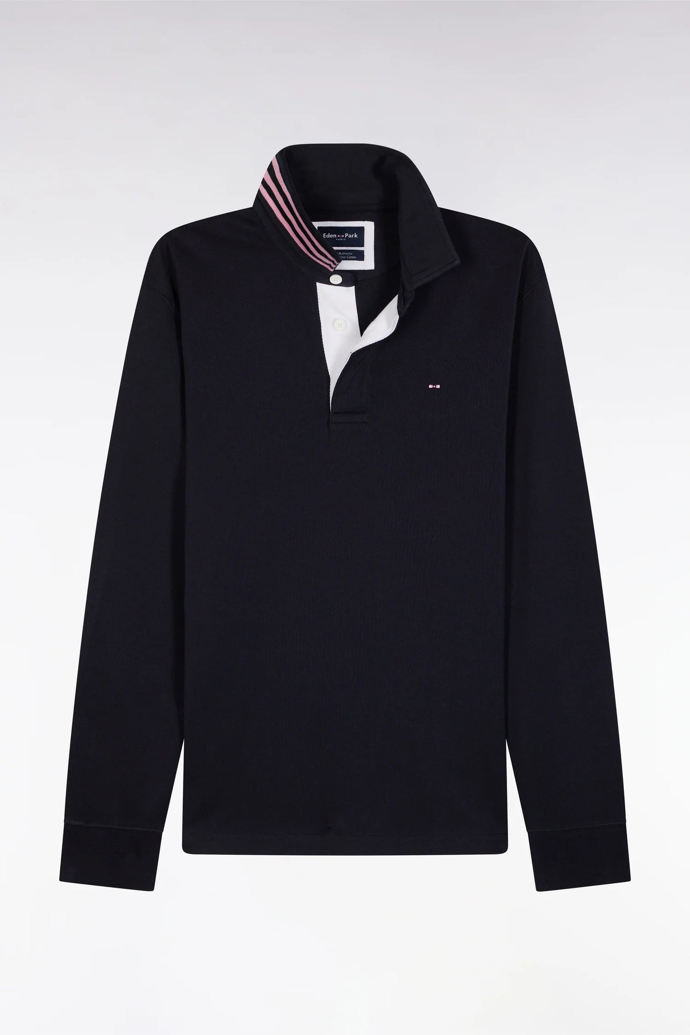 4-thread-count Pima cotton jersey and a straight cut finished with flat-knit ribbing give this long-sleeved jersey a long-lasting fit. The white-lined button placket and navy collar provide an elegant contrast, enhanced by a fine stripe under-collar. A comfortable, timeless sport-chic model designed for the modern man.