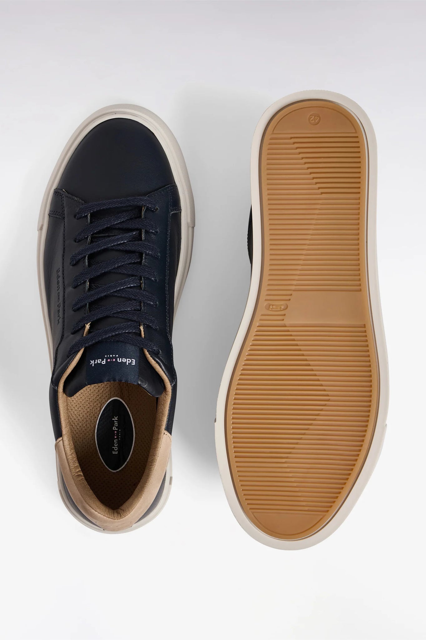 Designed to complement your urban silhouette, this low-top sneaker features sleek lines and refined finishes. Made in navy leather, they feature a sand-colored suede tongue embossed with the iconic Eden Park bow tie. A sober, elegant pair of sneakers, easy to match with your Eden Park wardrobe in any season.